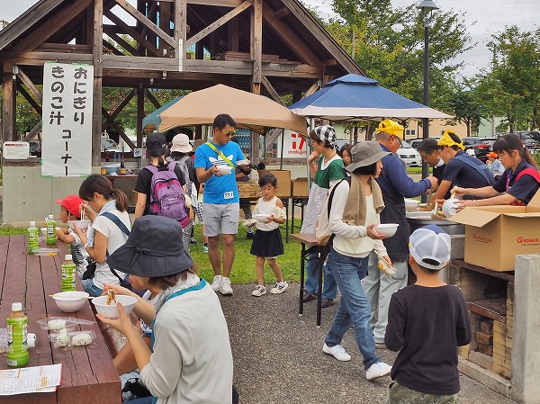 ウォーキング終了後のお楽しみ、おにぎりとスタッフお手製「きのこ汁」も大盛況で、昨年より大盛りに!