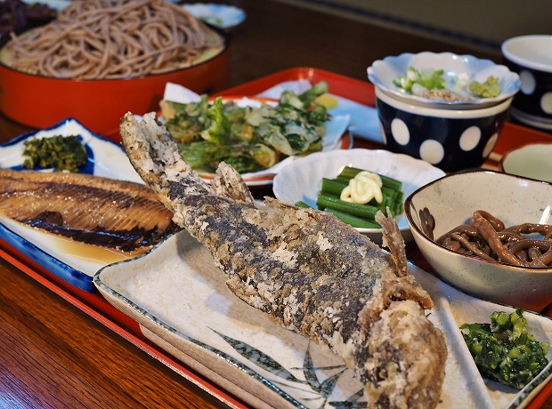 | お勧めメニュー | 一人当たり2,500円で、以下の料理がたっぷりいただけます↓ にしんの煮つけ、山菜の天ぷら、ニジマスから揚げ、そば 季節の山菜料理(ワラビの酢の物、ゼンマイの煮つけなど) |